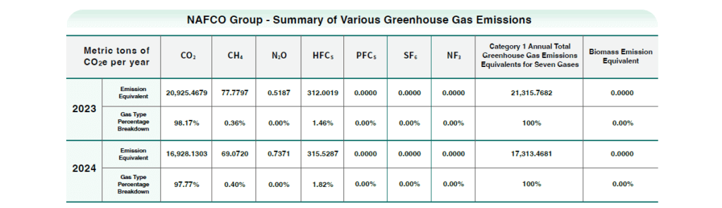 Aligned with the carbon reduction pathway outlined in the Paris Agreement, NAFCO began conducting comprehensive greenhouse gas (GHG) inventories in 2022. We have implemented related carbon reduction initiatives, identifying both direct and indirect GHG emission sources within our operational boundaries. This ensures transparency in disclosing carbon data, meeting the expectations of our customers and other stakeholders, and fulfilling our corporate responsibility to mitigate global warming.