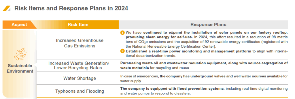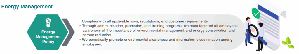 To enhance the efficiency of resources, we invest in energy conservation activities such as using the photovoltaic system, LED energy-saving bulbs, green power and energy, and inverter devices; replace the IE3 motors; and implement aircon automatic control. We have also many renewable energy certificates (RECs) to maximize the efficiency of energy and resources to effectively reduce carbon emissions. The real-time power monitor and management platform had been built in 2023 for the purpose of effectively improving the use of electric energy.